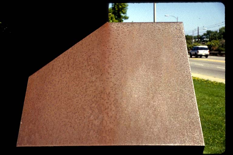 Rust on mature, skyward-exposed weathering steel, showing redder appearance where the rusted surface is subjected to runoff of water from higher sections of the work. (1)